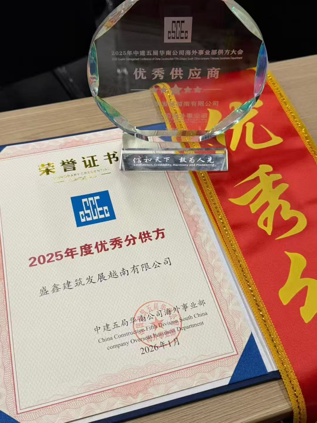 近日,广东汇赢模块化房屋科技有限公司旗下越南分公司盛鑫建筑发展越南有限公司,在中建五局华南公司海外事业部供方大会上,凭借卓越的产品品质与专业的服务能力,荣获“2025年度优秀分供方”称号。广东汇赢模块化房屋科技有限公司(分公司简称“盛鑫建筑”)荣获此项殊荣,我们倍感欣喜、备受鼓舞,未来也将不忘初心、笃行不怠,在建筑行业深耕细作,全力助力每一个项目落地见效、精益求精。这不仅是对盛鑫建筑在越南市场深耕成果的高度认可,更是广东汇赢在海外模块化建筑领域实力的有力见证。